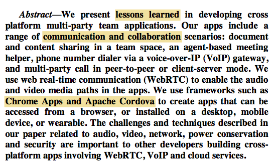The focus is on three things: cross-platform, WebRTC and team apps. Our team apps deal with communication and collaboration use cases, particularly for enterprises. And we use Apache Cordova and Chrome Apps as cross-platform development tools.