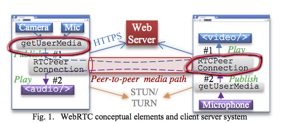 Fig.1 shows the two high level abstractions: get-user-media is used to capture the local stream from camera and microphone, and peer-connection is used to represent peer-to-peer channel. Fig.1 shows how the media captured from one browser is attached to the peer connection and displayed on the others, in both directions.