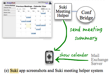 Suki meeting helper agent joins your conferences and captures meta data and notes, and at the end of the meeting sends it to you. The Suki client app shows past meeting summaries in your calendar.