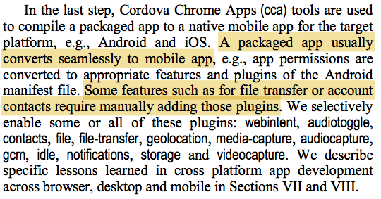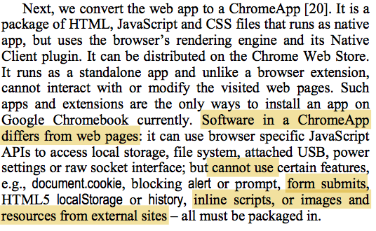 Converting a web app to chrome app is not trivial due to several constraints. For example, it cannot have inline scripts, or inline load of images or other resources from external server. The paper has more details on the challenges and techniques.