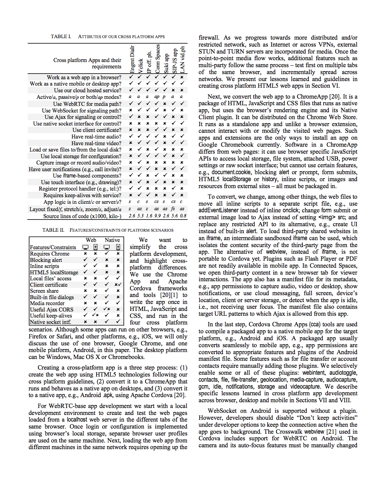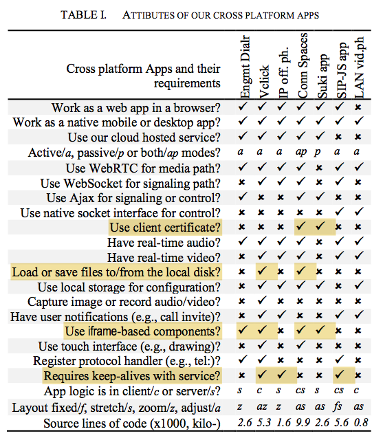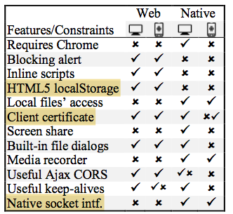 Table II summarizes the differences in constraints on these platform categories. For example HTML5 localStorage is available only for web app, not installed. Whereas native socket interface, e.g., for UDP or multicast, is available only for installed apps, but not from within a browser. Client certificate is generally supported everywhere, but on installed mobile app, the support is ongoing and not fully functional. Some details are in the paper.